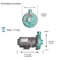 Motobomba Centrífuga Monoestágio – Monobloco – Motor Monofásico ou Trifásico em II Polos, 60Hz, 3500rpm – Bocais com rosca BSP, Sucção 1.1/2″ x Recalque 1″. Utilizada para água limpa até temperatura de 40ºC (Temperaturas superiores, consultar opções). Carcaça da bomba em ferro fundido GG-20. Rotor fechado em termoplástico. Anel O’ring de vedação da carcaça em Buna N. Selo mecânico: Faces em grafite e cerâmica. Mola em inox 304 e elastômero (borracha) em Buna N.